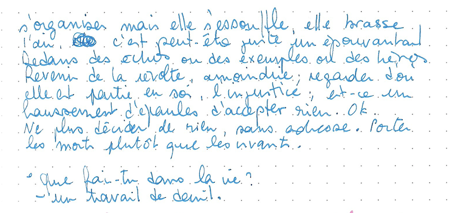 Revenir de la révolte amoindrie ; regarder d'où elle est partie en soi, l'injustice ; est-ce un haussement d'apules d'accepter rien. Ok.